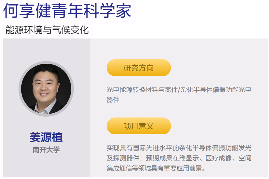 本次入选“何享健青年科学家”项目的20位青年科学家涵盖两大重点领域,其中医学与生命科学领域12人、能源环境与气候变化领域8人。我校特聘研究员姜源植在能源环境与气候变化方向成功入选,彰显了其在科研创新与学术积累方面的实力,同时也充分体现了我校在青年科研人才培养与原始创新能力建设方面取得的成效。
